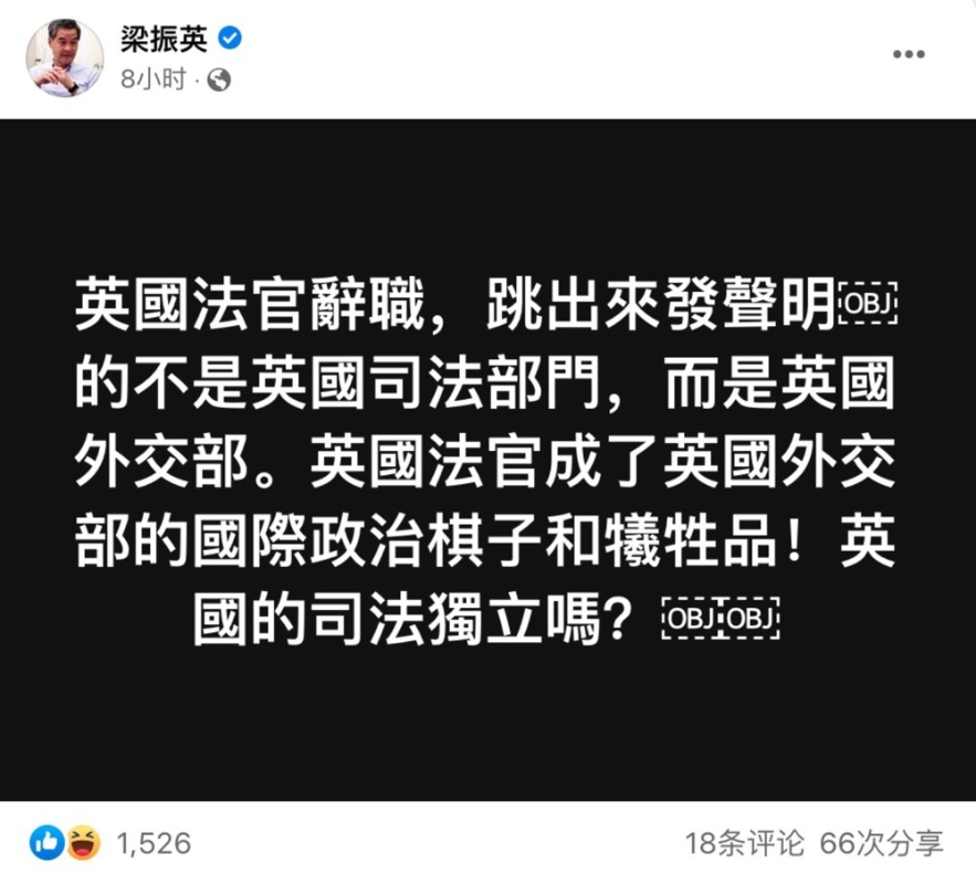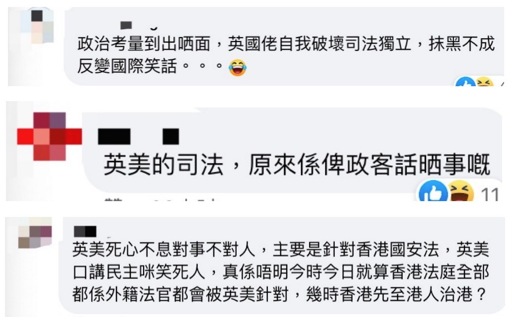 社交媒體截圖 不少網友亦紛紛留言嘲諷英國此舉反暴露了自身司法“非獨立”——“抹黑(香港)不成,反變國際笑話!”“英美的司法,原來是政客說了算!”