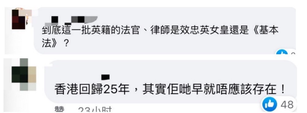 網友評論 也有網友直言對外國人在中國的土地上掌握司法權的現象感到不滿:“香港回歸25年,其實他們早就不該存在!”