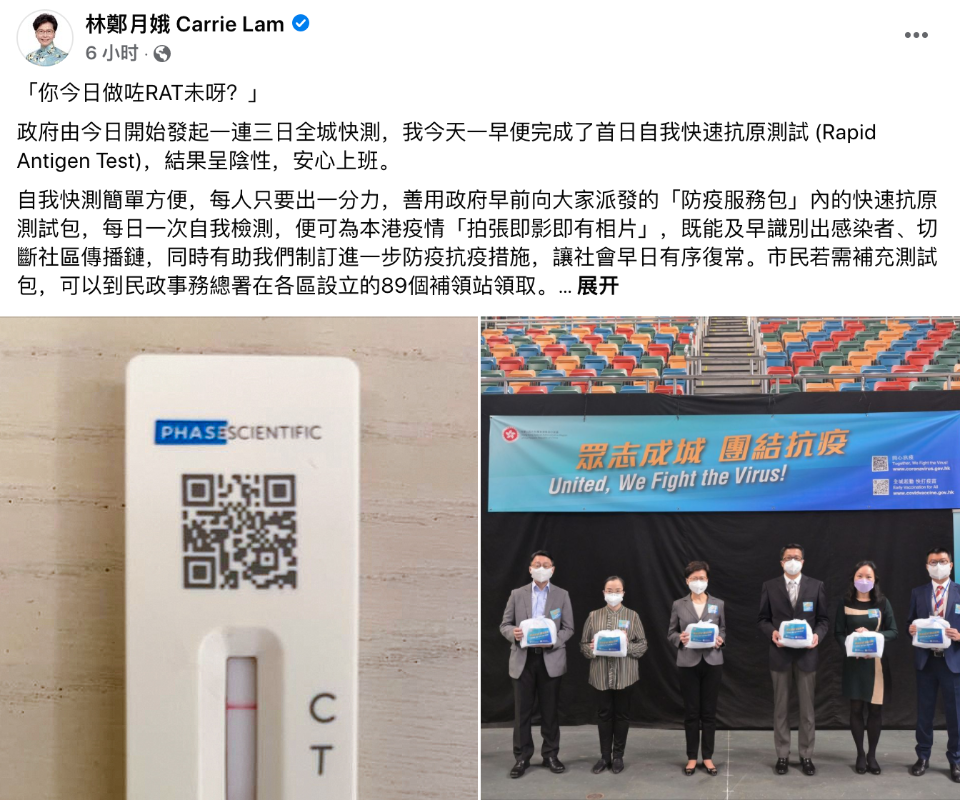 圖源:林鄭月娥fb 林鄭指出,自我快測簡單方便,每人只要出一分力,善用政府早前向大家派發的“防疫服務包”內的快速抗原測試包,每日一次檢測,便可為香港疫情“拍張即影即有相片”,既能及早識別出感染者、切斷社區傳播鏈,同時有助政府制定進一步防疫抗疫措施,讓社會早日有序復常。 林鄭說,市民若需補充測試包,可以到民政事務總署在各區設立的89個補領站領取。 她又提醒市民緊記如檢測結果呈陽性,應立即用手機拍下照片,並在24小時內呈報衞生防護中心“2019冠狀病毒快速抗原測試陽性結果人士申報系統”,避免外出,以便讓政府安排適切的家居支援、隔離或治療。 【編輯:李冉】