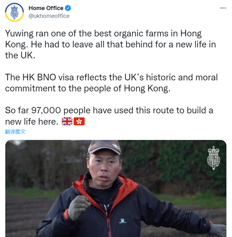 英國內政部推片“歡迎”港人移民,結果英網友不高興了!香港新聞網4月14日電 近日,英國內政部在其官方推特賬號上發布了一條長約4分鐘的影片,試圖向外界展示為何港人要移英以及移英後的心路歷程。英國內政部其後還將該影片置頂,不過有關操作隨即引發一些英國人的不滿…… 據悉,影片主人公黃如榮在移英前已在香港經營有機農場12年。對於移英原因,黃如榮聲稱是為了自己的孩子,想給他們“希望及未來”。 至於香港現狀,黃如榮則抹黑稱,市民“無法自由發聲”。一些人想要離開香港,而英國政府推出的英國國民(海外)(BNO)留英計劃“5+1”方案則給了他們一條移民的路。