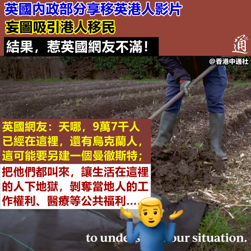 在影片中,黃如榮還透露,剛移民英國時,本無計劃繼續種菜,但落腳後發現家中就有後花園,於是將其改裝成迷你農場,種植各類蔬菜。 “我們不是來英國拿東西的,只是希望英國人能理解我們的狀況。”在影片中,黃如榮向外界宣稱,香港人移民英國是“別無選擇”,是為了更好的教育、為了孩子有更好的未來等。 他又向英方“獻媚”稱,英國是個好地方,遇見的英國人也很歡迎他們。他的兩個孩子已經在英國上學,妻子亦在超市工作,希望能為英國做貢獻。 英國內政部在推特上發布該影片時亦“自誇”稱, BNO簽證政策反映了英國對香港人的“歷史和道義承諾”。迄今為止,已有9萬7千名香港人循這一路徑在英國開始了新生活。 英國政府妄圖透過有關影片,向外界“宣傳”港人移民在英國是受歡迎的、被接納的,這些港人在英國的生活亦會“幸福美滿”。然而,在該條推文的評論區內,一些英國人顯然已經不高興了! “天哪,9萬7千人已經在這裡,還有烏克蘭人......我們最終會被趕出去,這樣就有地方安置這些人了。”部分英國網友不滿地說,移民已經太多了,再歡迎這麼多人移英是個瘋狂且不負責任的想法,這可能要另建一個曼徹斯特。 “真是個‘動聽’的故事......”有英國網友則向英政府發出靈魂質問:“現在告訴我們,你們為英國無家可歸的士兵、退伍軍人以及無家可歸者提供了多少房屋?這應該也是個‘好’故事.....你們安置了多少呢?” 也有英國網友擔憂移英港人會搶佔當地資源,令當地人的生活陷入困境——“是的,把他們都叫來,讓生活在這裡的人下地獄,剝奪當地人的工作權利、醫療等公共福利……” “我們租了一個島,然後在租約結束時將其歸還。”還有英國網友強調,香港與中國內地的任何問題都是中國內政,不關英國的事。英國已經“人滿為患”、沒有空間容納更多移民了。