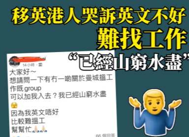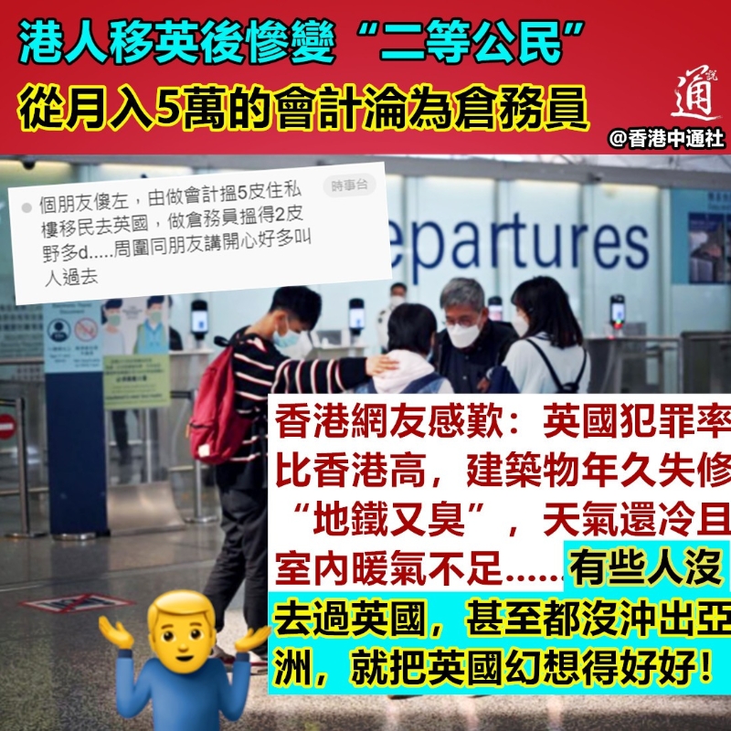 (圖源:頭條日報) 自英國政府推出英國國民(海外)(BNO)護照“5+1”方案,企圖吸引更多港人移民後,部分戀殖崇英的人離港赴英。然而其後卻頻傳,一些原本享受高薪厚職的港人移英後只能委身於工廠等地打工......有關慘況令人唏噓! 此次,有網友再爆料在香港屬精英階層的朋友,移英後亦只能去做倉務員,一時間引發網友熱議。 在討論區內,有見慣移英港人苦況的網友直言,“連登仔”叫人移民好傻! 有網友則“嫌棄”地說,原來英國薪水這麼“低”,替移英港人感到“不值”的同時,亦提醒有心人士,就算在香港做倉務員也能月入2萬元,“現在做保安都差不多2萬啦!”質疑港人移英付出與收入難成正比。 除了計算薪水,也有網友比較起英國與香港的生活舒適度,直言英國犯罪率比香港高得多,建築物也年久失修,“地鐵又臭”,天氣還過於陰冷且室內暖氣不足......諷刺有些港人沒去過英國,甚至都沒衝出亞洲,就把英國幻想得過於“美好”。 至於不明英國就業行情的網友還在“出謀獻策”,“洗腦”移英港人“可以做回本行”……有香港網友亦忍不住點出現實、怒懟道,“二等公民”不就做(倉務員)這些工種嗎?