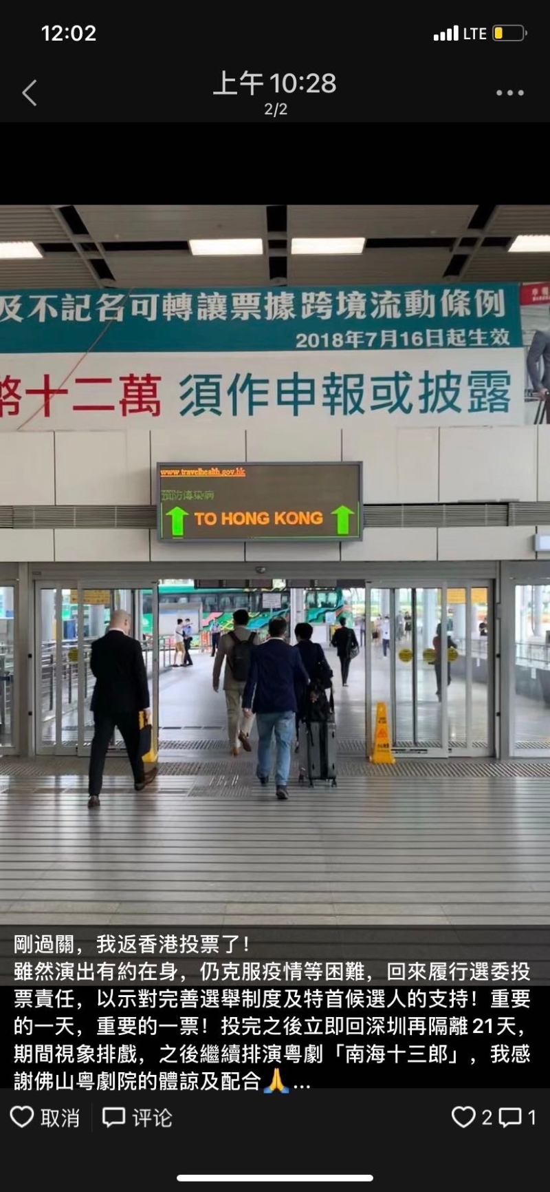高志森表示,今日整個選舉流程非常順暢,選舉事務工作也辦得很好,工作人員雖然戴著口罩,但是氣氛友善。他又說,今天過關時間緊張,10點才能過關,因此很怕趕不及在11點半之前投完票。到場後,他匆忙地投完票,沒有跟朋友聚會,也沒有拍照就回到深圳,到了深圳之後會隔離21天。 【編輯:刘春】