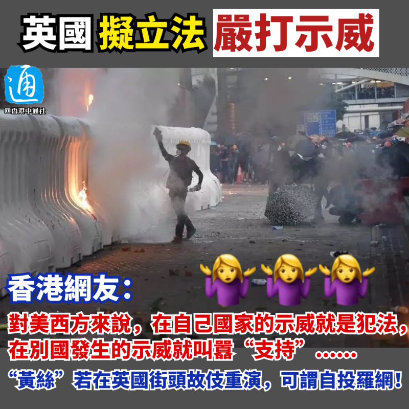 (香港新聞網製圖) 最近在地方選舉中遭遇慘敗的英國首相約翰遜政府,10日在新一屆國會上公布未來一年施政大計,針對近年英國當地各類型示威漸趨激進,經常有示威者透過堵塞鐵路或機場等重要基建設施的做法,當局建議立法加強對在“重要國家基建”抗議的示威者的罰則,違者最高可以被判監12個月。 或是為維護 “民主”形象,英國政府亦不忘冠冕堂皇地向外界宣稱,這項新法案只會針對“極少數”被當局視為“危險及非常具破壞性”的示威者,不會影響絕大部分民眾的示威權利。 值得注意的是,法案同時提出擴大英國警方截查搜身權力,讓警員能夠針對上述新設罪行充公所需物證。 2019年香港“修例風波”期間,示威者曾多次於多區堵塞馬路、在機場搞示威,這些曾被英國政客視作所謂“和平示威”的舉動,到了英國新法案中就“搖身一變”,成了被嚴令禁止的刑事罪行。 同時,香港警察對示威者作出的合理合法的驅散及執法行動,亦曾有一批英國政客跳出來污蔑 “港警權力無限大、濫暴”。未料,如今英政府自己卻在新法案中擴大英國警方截查搜身權力。 英國政府“寬容”他國示威者,卻“嚴打”本國示威者的行徑,徹底“看樂”了一群香港網友! 在相關新聞的評論區,有網友毫不客氣地揭穿英政府 “雙標” 的真面目,直言對於美西方來說,在自己國家(的)示威就是犯法,在別國發生的示威就叫囂“支持”,“原來自由是這樣用的”。