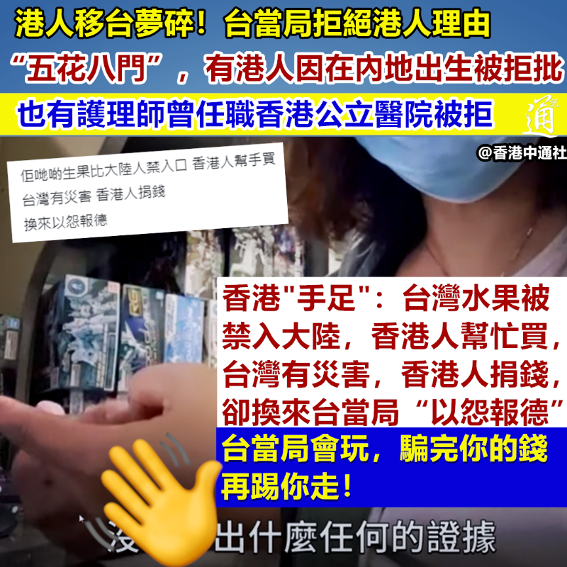 香港新聞網5月12日電 香港發生“修例風波”後,台當局口喊 “撐香港”、允諾香港“手足”將來可於台灣容身。但現實呢? 近日,有台媒披露港人移台退件,顯示一些港人僅因在中國大陸出生,就因“出生地原罪”被台當局退掉。從文件可知,台當局拒絕港人的理由“直接且五花八門”,聲稱來自香港的專業護理師曾任職公立醫院,“對中國大陸有忠誠度”;又說曾擔任香港城市大學圖書館長的是香港公務員,會危害台灣“國安”。儘管當事人補件,指這不算公家機關,也沒簽署效忠特區政府的聲明,卻遲遲等不來台當局的回應,移台夢宣告破碎! 定居申請遭台拒絕、在內地出生的港人Amy於視頻中控訴:“申請的時候,(台當局)就知道我們(是)大陸出身,你搬出生地擋我,我們怎麼回到媽媽肚子裡再投胎?”