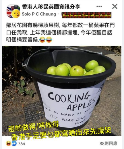 香港新聞網5月19日電 部分“黃絲”港人移居英國後,已經鬧出了不少笑話。近日,又有移英“黃絲”自爆了一件“順手牽羊”後被他人點破的醜事。豈料,這位移英“黃絲”不以為恥,反以為榮…… 在“香港人移民英國資訊分享” 臉書群組內,一位移英“黃絲”發文稱,他的鄰居在花園種了幾棵蘋果樹,每年都會放一桶蘋果在門口“任他取”,並附上了一桶蘋果的圖片。 圖中只見一個塑料桶裡盛滿了新摘的蘋果,桶的外側貼有大大的紙張,寫著幾行英文,表明這是“用於烹飪的蘋果”,“你想拿多少拿多少”。值得注意的是,有關說明的下方還有一行字——“但是請把桶留下” 。