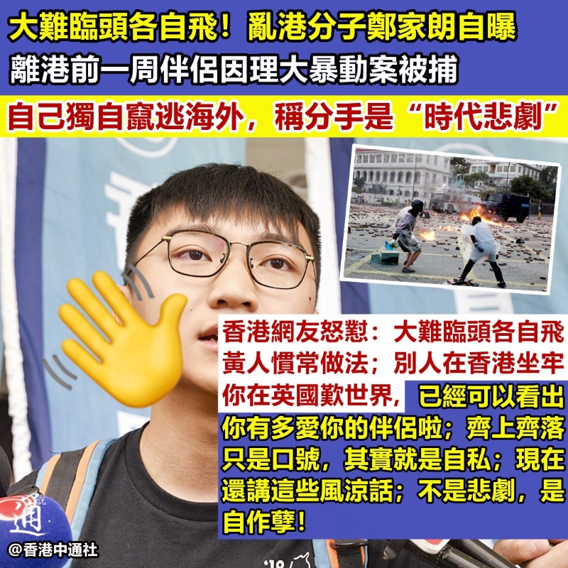 大難臨頭各自飛?亂港分子鄭家朗自曝拋下女友,孤身竄英分享到: