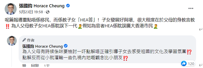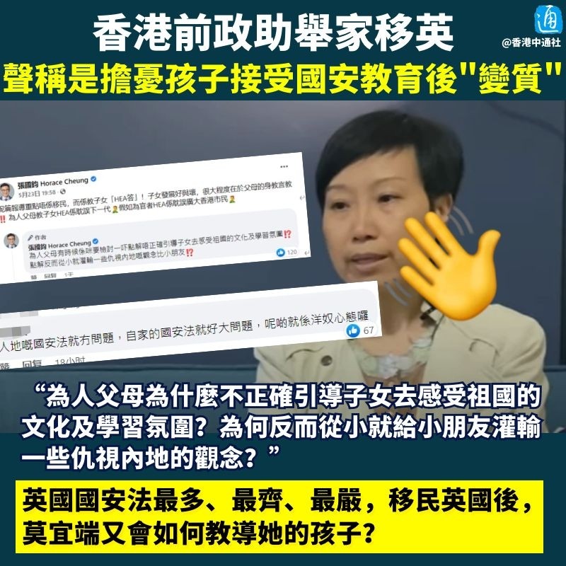香港中通社製圖 莫宜端聲稱,之前沒有考慮移民這件事,直到去年讀初中的兒子參加國安教育日的問答比賽。她問兒子會如何回答問題,兒子告訴她:“hea(隨便、敷衍)答嘍,你說的嘛。”莫宜端隨即又叮囑兒子,“現在這樣的時勢,在學校千萬不要向別人透露是媽媽教你這麼說的。” 之後,兒子又問莫宜端,如果有一天要考國安法怎麼辦?莫宜端竟“教導”孩子,“You believe what you believe(你要堅守信念),但課程有這樣的要求,你就要跟答案答。” “好鄙視自己!”莫宜端聲稱,自己對國安教育“低頭”的行為如同在教授孩子何謂表裡不一,又擔憂孩子接受國安教育後,無法保全所謂“信念”,“或者幾年後他(指孩子)會問,為何爸媽不喜歡我去內地交流,現在去大灣區多點交流不是很好嘛......可能他又會變得在家中表裡不一(而不是在學校),我接受不到。” 擔憂兒子“變質”、被“洗腦”,莫宜端因此決定舉家移民英國。 “為人父母教子女HEA(隨便、敷衍)是耽誤下一代!為官者HEA是耽誤廣大香港市民!”眼見莫宜端“誤導”子女,立法會議員張國鈞在社交媒體發文批評稱,子女發展的好與壞,很大程度在於父母的言傳身教。 其後,他又在評論區質疑,“為人父母為什麼不正確引導子女去感受祖國的文化及學習氛圍?為何反而從小就給小朋友灌輸一些仇視內地的觀念?”
