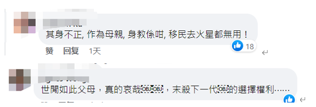 社交媒體截圖 香港網友也紛紛對莫宜端的行為表示不滿。 有網友直言,“其身不正,作為母親,如此言傳身教,移民去火星都沒有用!”也有網友認為莫宜端所謂的“為下一代好”,不過是強加自己的政治意願給白紙一般的孩子,是在抹殺下一代的選擇權,其行為非常自私。