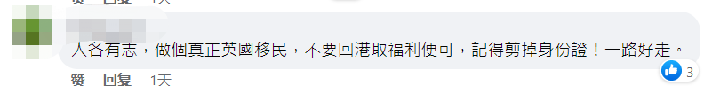 網友評論 “人各有志,不要回港取福利即可,記得剪掉香港身份證!”還有網友則“拍手掌”歡送莫宜端之流離港,但就提醒不要妄想“腳踏兩只船”,既要英國所謂“自由”,又惦記著香港福利。