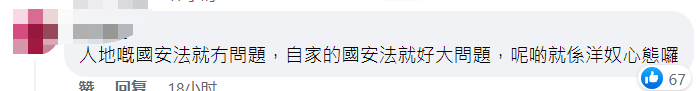 網友評論 還有網友一針見血地指,莫宜端抵抗香港國安法的行為非常“雙標”——“別國的國安法就沒有問題,自家的國安法就有好大問題,這就是洋奴心態嘍。”
