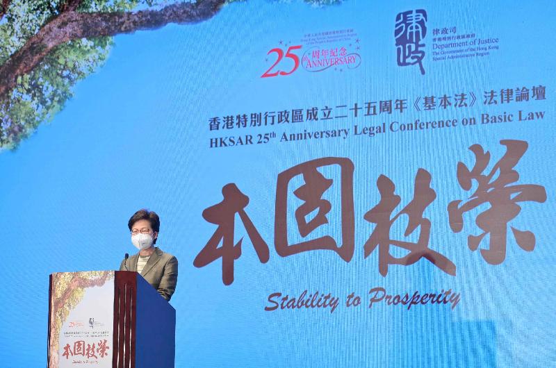 香港特區行政長官林鄭月娥出席香港回歸25周年基本法法律論壇。圖源:香港特區政府網站 林鄭月娥表示,香港特區自成立以來,總體順暢,成績斐然。要認識基本法,必須回到“一國兩制”的初心。她堅定相信,唯有根據憲法和基本法辦事,依靠中央,維護國家安全,才能確保香港的繁榮穩定。 國務院港澳辦副主任王靈桂在視頻致辭中指出,“一國兩制”是中國共產黨百年奮斗歷史的重要篇章,基本法為“一國兩制”在香港特區的實踐提供了法律保障,奠定了香港繁榮穩定的基石。25年來,“一國兩制”實踐取得了舉世公認的成功。未來5年,是香港從“由亂到治”走向“由治及興”的關鍵時期,要堅定不移走“一國兩制”正確道路,確保基本法全面準確實施。 中央政府駐港聯絡辦副主任陳冬在視頻致辭中指出,全面準確落實基本法,必須堅守“一國”原則。回歸25年來,基本法的貫徹實施維護了國家主權、安全、發展利益,維護了中央對港全面管治權。針對一個時期“反中亂港”活動猖獗,中央審時度勢、果斷出手,通過一系列標本兼治的舉措,牢牢守住了“一國”底線,確保“一國兩制”實踐始終沿著正確方向前進。 陳冬續指,全面準確落實基本法,必須充分發揮“兩制”優勢。25年來,香港經濟保持平穩發展,各項社會事業邁上新台階。香港只要堅守“一國”之本,善用“兩制”之利,更好融入國家發展大局,就一定能有效應對各種風險挑戰,續寫“一國兩制”實踐的新篇章。陳冬強調,要始終堅定制度自信,堅定維護憲法和基本法確定的憲制秩序,完善特別行政區同憲法和基本法實施相關的制度和機制,持續加強憲法和基本法教育,推動“一國兩制”實踐行穩致遠。 外交部駐港公署特派員劉光源、解放軍駐港部隊副政治委員王兆兵、全國人大常委會香港基本法委員會副主任譚惠珠,及香港特區終審法院首席法官張舉能、律政司司長鄭若驊、立法會主席梁君彥等出席。全國人大常委會香港基本法委員會主任沈春耀、全國港澳研究會會長鄧中華視頻發表主題演講。 【編輯:馬華】