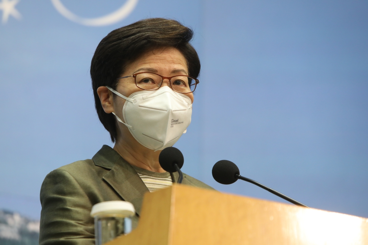 香港新聞網5月31日電 香港特區行政長官林鄭月娥31日見記者時表示,慶祝回歸25周年活動展開,主題曲《前》當日首播。 記者會上的藍色背景板投影出25周年紀念的標誌,以及播放主題曲。