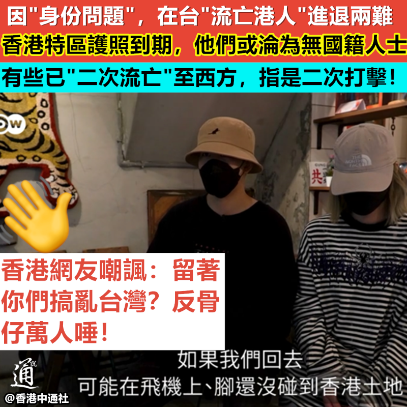 部分參與黑暴事件的港人為避刑責,“委身”台灣。然而,台當局卻未完全兌現當日“豪言”,給予竄台的香港示威者“庇護”。 亂港分子黃之鋒曾於2019年鼓動台當局在“難民法”上有所調整,給予港人“更多實質協助”,但台當局一直不願意鬆口。 鑒於台灣未通過“難民法”,在台“流亡港人”亦無從申請“庇護”。 現時,赴台的香港示威者可以通過就業或就學的方式在台居留,但這僅是擁有暫時在台居留的資格。 兩名在台“流亡港人”近月雖獲准就業居留,但仍感到惶恐不安。 “我在這邊有一個工作,那我的居留證可能就是合約到期那天。如果我中途突然被人解僱了,”在台流亡港人Mark擔憂地說,除非屆時很快、即刻找到一份新工作并簽約,“否則理論上就要滾回香港。” 遲遲拿不到“台灣身份證”,一旦香港特區護照到期,在台“流亡港人”亦可能隨時淪為無國籍人士...... 據悉,不少竄台的香港示威者就因“身份問題”不得不“二次流亡”至西方,這對在台“流亡港人”可謂“二次打擊”。 在台流亡港人Kelly(化名)形容,就像是曾經樂觀了好幾年,覺得好像有機會定居台灣了,但之後又被台當局刮了一巴掌,直言對台當局所謂“撐港”政策“失望,因為最早是台灣說支持香港的......” 兩年前,台灣成立“台港服務交流辦公室”,宣稱這是台灣“撐香港”的重要里程碑、要為“流亡港人”提供所謂“人道援助”。但德媒指,有消息稱過百港人無一獲得“庇護”。 “台灣政界多次公開挺港,但有別於西方,這份同情并未落實為具體政策。”對此,德媒“毫不留情”地總結、暗諷台當局所謂“撐香港”政策。 在台“流亡港人”今時今日進退兩難的境遇,令不少香港網友看後直嘆“早知今日何必當初”! “自找的!”香港網友紛紛在視頻下方留言斥責在台“流亡港人”已成“過街老鼠”,“出來混總是要還的”,“留著你們搞亂台灣?反骨仔萬人唾。”