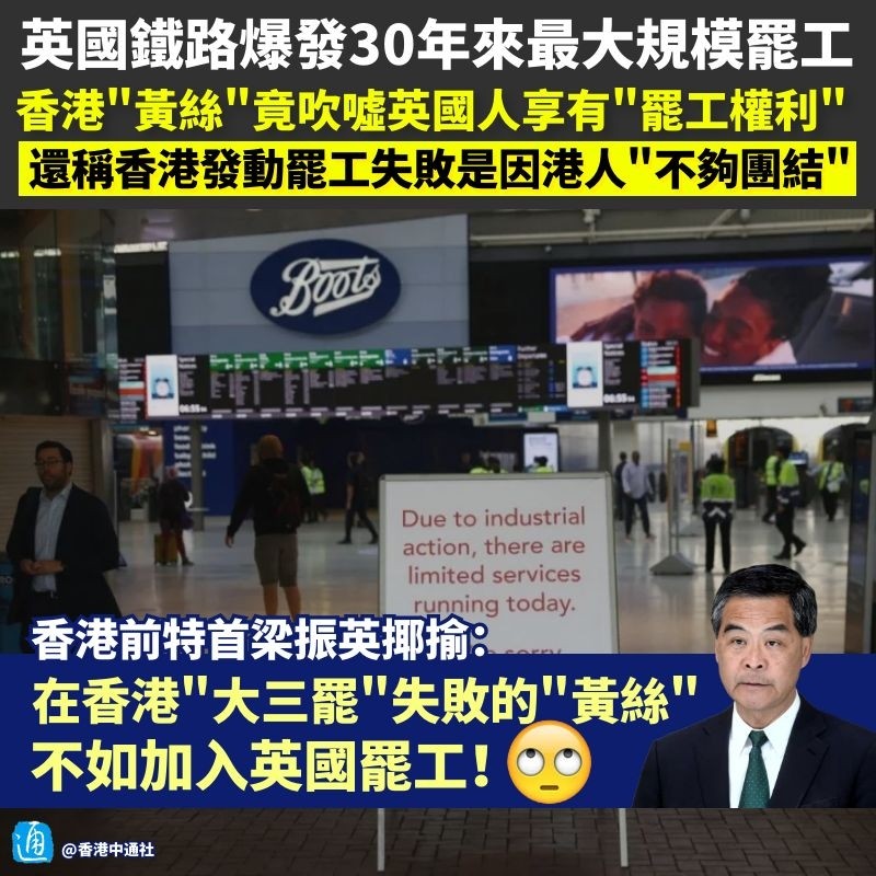 香港中通社製圖 報道稱,這是近33年來,英國首次只有20%的火車線路維持運營,成千上萬無法在家工作的人被迫開車上班,或是付出數倍的代價乘坐高價出租車上班。 英國鐵路罷工給當地民眾造成諸多不便,未料竟有香港“黃絲”上趕著碰瓷,叫囂英國人比香港人優越的地方就在於“享有罷工權”,有人更順勢總結所謂英國罷工成功的經驗,“反思”在香港發動罷工失敗皆因“黃絲”“像一盤散沙。” 在香港“黃絲”大本營——連登討論區中,還有人“無知”地腦補稱,如果在英國,警方一旦抓捕煽動罷工的人,或公司炒掉參與罷工的人,其他人會立刻無限期罷工,並就此給英國人戴高帽,聲稱他們“夠團結”……