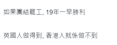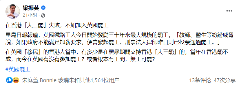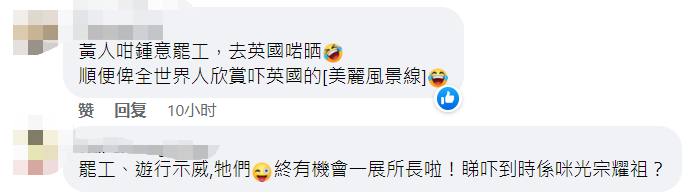 社交媒體截圖 梁振英調侃,“移民”英國的香港人當中,有多少是在黑暴期間支持香港“大三罷”的,當年在香港罷不成,如今在英國有沒有參加罷工?或者根本沒有工可開,無工可罷? 網友也紛紛調侃,既然“黃絲”這麼喜歡罷工、遊行示威,那剛好去英國“一展所長!”“順便讓全世界欣賞一下英國的‘美麗風景線’。”