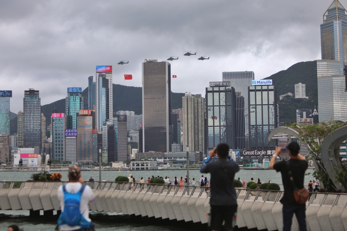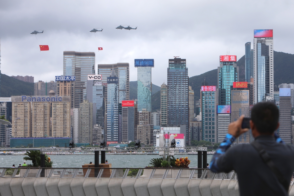 香港新聞網7月1日電 7月1日中午時分,香港特區政府飛行服務隊採用固定翼飛機及直升機組成四機編隊,在維港上空懸掛五星紅旗和香港區旗進行飛行表演,以慶祝香港回歸祖國25周年,吸引許多市民觀看拍照。