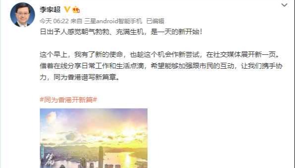 香港特區行政長官李家超。圖源:直播截圖 當天早上,李家超在3個社交網站發佈第一個帖文是一張日出的照片,附有其競選口號“同為香港開新篇”。 李家超寫道:日出予人感覺朝氣勃勃、充滿生機,是一天的新開始!這個早上,我有了新的使命,也趁這個機會作新嘗試,在社交媒體展開新一頁。藉著線上分享日常工作和生活點滴,希望能夠加強跟市民的互動,讓我們攜手協力,同為香港譜寫新篇章。 相隔約兩小時,李家超發佈第二條帖文,附上有其夫人為他整理衣裳的圖片,並寫道:還有兩個多小時,慶祝香港回歸祖國25周年大會暨香港特別行政區第六屆政府就職典禮就會開始。這段日子,慶幸有太太Janet為我打點一切,讓我無後顧之憂,全心全意迎接新的使命。我想趁這個特別日子,感謝Janet多年來默默地在我背後支持我及照顧家庭。未來五年,我更需要妳的扶助,讓我可以全情投入,為香港每一個家庭的幸福而努力。 【編輯:馬華】