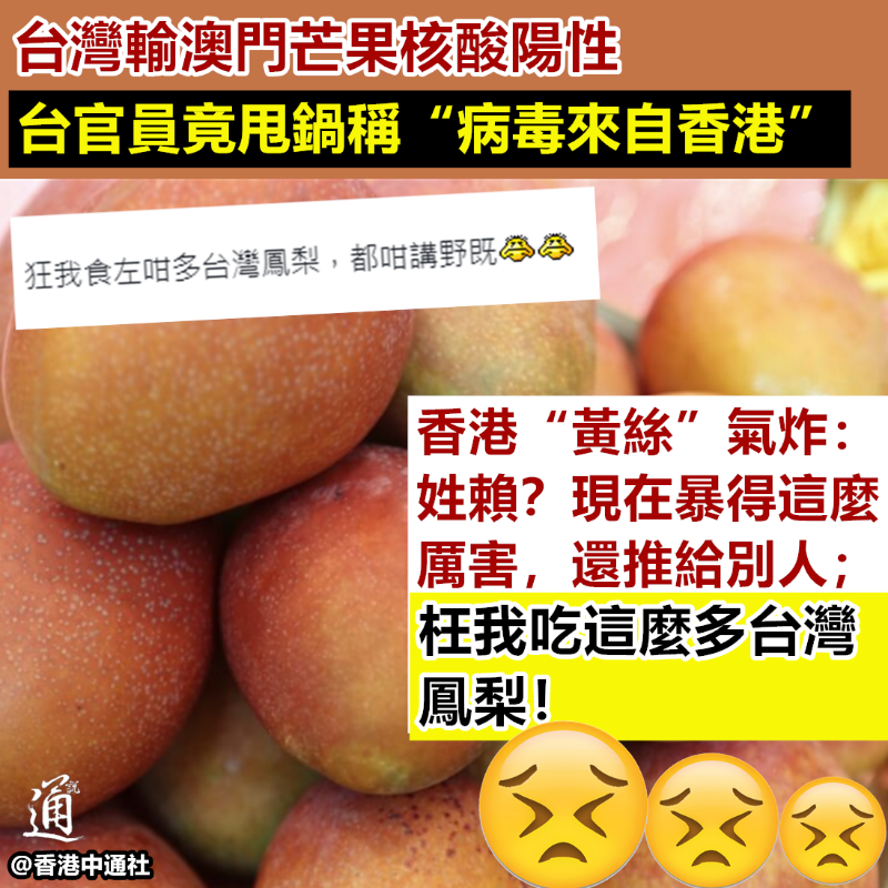 香港新聞網7月5日電 “忘恩負義”的台當局,這下,徹底把香港“黃絲”得罪了! 此前,一批由台灣地區輸往澳門的芒果樣本被檢測新冠病毒核酸呈陽性,澳門市政署隨即啟動應急預案,將20箱共重100公斤的涉事貨物全數封存銷毀,并宣布暫緩涉事廠商相同來源產品入口一周。 台灣外銷芒果再出事,台“農糧署長”胡忠一7月2日回應有關查詢時卻“語出驚人”,聲稱負責處理的三家外銷業者都沒被驗出有問題,又甩鍋稱被驗出新冠病毒的芒果,都是從香港過去的。 他聲稱,到底哪個環節出問題,目前無法得知,但認為事情“很奇怪”。