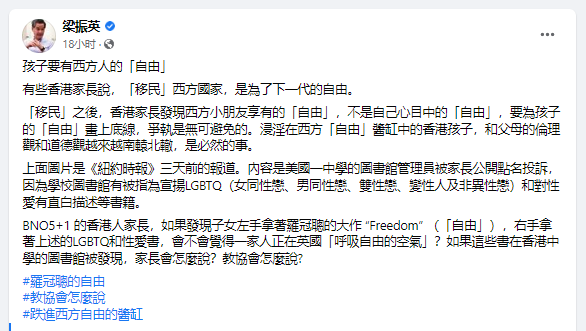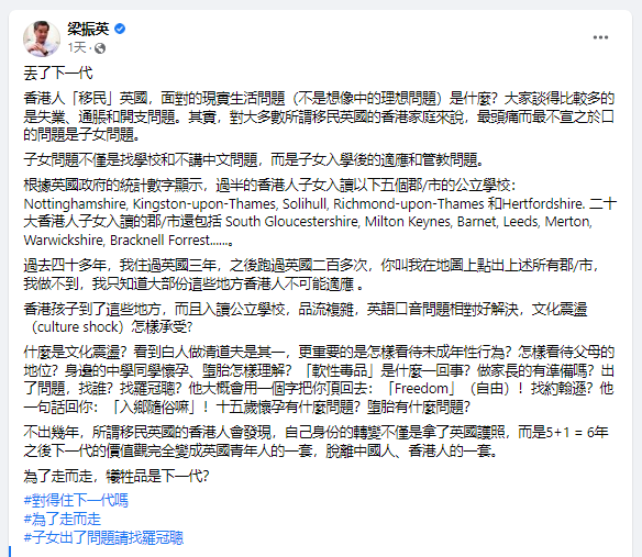 (梁振英臉書截圖) “子女問題不僅是找學校和不講中文問題,而是子女入學後的適應和管教問題。”梁振英提到,英國政府的統計信息指出,香港人子女入讀的英國公立學校,逾半集中在諾丁漢郡(Nottinghamshire)、泰晤士河畔金斯頓 (Kingston-upon-Thames)、索利赫爾(Solihull)、泰晤士河畔里士滿(Richmond-upon-Thames)和赫特福德郡(Hertfordshire)這五個郡或市…… 梁振英就以“過來人”的身份指,自己曾在英國居住三年,又“跑過英國二百多次”,也無法做到“在地圖上點出上述所有郡或市”,直言這些以往華人較少聚居的冷門地,大部分“香港人不可能適應”。 “香港孩子到了這些地方,而且入讀公立學校,品流複雜。”梁振英擔心,對移英港人的子女來說,英語口音問題相對好解決,文化震蕩才真的難以承受。如“看到白人做清道夫”、目睹身邊的中學同學懷孕或墮胎、看到周圍人吸食 “軟性毒品”等。這或給移英港人的子女帶來極大的文化衝擊。 “做家長的有準備嗎?出了問題,找誰?”梁振英向移英港人拋出連串靈魂拷問,強調若找靠販賣“西式民主自由”就忽悠港人移英的亂港分子羅冠聰討說法,他大概會用所謂“Freedom(自由)”把港人頂回去;若找才發表辭職演說的英國首相約翰遜,他亦只會用“入鄉隨俗”來搪塞香港人。畢竟在英國社會,十五歲懷孕或墮胎早不被視為大問題。 而針對有些香港家長說,移民西方國家是為了下一代的“自由”的說法,梁振英10日的帖文亦指出,移民之後,香港家長會驚覺西方小朋友享有的“自由”並非自己心目中的“自由”,而當家長為孩子的“自由”畫上底線時,家庭矛盾相信無可避免。“浸淫在西方‘自由’醬缸中的香港孩子,和父母的倫理觀和道德觀越來越南轅北轍,是必然的事。”