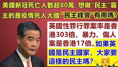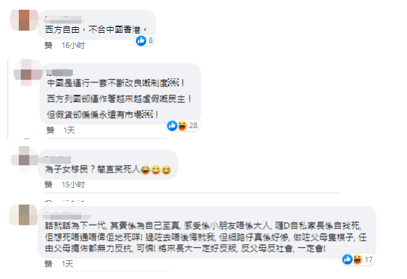 (梁振英臉書截圖) 梁振英最新的帖文還展示了,英國教育大臣日前在首相府門外向示威者舉中指的一幕。試問教育大臣尚如此質素,令人不由得擔心移英港人的子女在英國會接受何種教育…… 梁振英預料,移英港人不出幾年就會發現,自己身份的轉變不僅是拿了英國護照,“而是6年後下一代的價值觀完全變成英國青年人的一套,脫離中國人、香港人的一套”。 他一針見血地指,移英港人“為了走而走”,“犧牲品”或許正是下一代! 梁振英的帖文亦引起香港網友關注和討論。在評論區,有網友總結,所謂“西方自由,不適合中國香港”。 有網友對比後直指,“中國運行(的是)一套不斷改良的制度”,而西方國家卻奉行 “越來越虛假的民主”,無奈地哀歎這樣的“虛假民主”在“黃絲”港人中“卻偏偏有市場”。 還有網友批評,移英港人口說“為下一代移民”,實際是為了自己。直指這些移英港人父母將來會自食其果,被英國所謂“自由大法”浸染的移英港人下一代或變得“反叛”,開始反對香港父母的那一套。