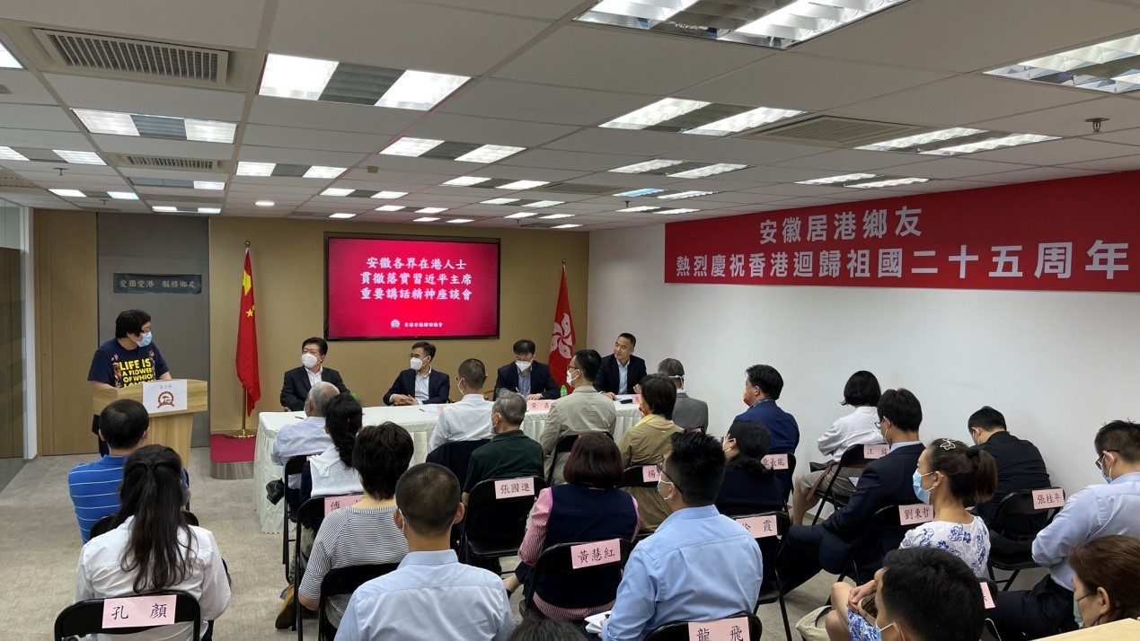葛焱坤介紹,7月1日以來,總會組織多場次不同界別人士學習交流活動,召開此次座談會的目的是在各界學習宣傳貫徹熱情高漲的良好氛圍中,進一步聚焦如何長期貫徹幷深入落實講話精神,真正把講話精神落到實處。 吳志斌就香港安徽聯誼總會如何長期貫徹幷深入落實講話精神作主題發言。他提出一是要持續學習宣傳貫徹習主席重要講話精神,結合安徽社團特點,通過“條塊結合”+“學習小組”的方式,將習主席重要講話精神宣傳貫徹到每一名安徽鄉友與家庭中。二是圍繞習主席在講話中的要求,進一步發揮安徽特色,著力建設“一會一特色”地市及專業屬會,搶抓皖港同頻發展中科創、文化合作交流機會。三是進一步為廣大鄉友提供精准切實的服務,發揮同鄉社團的力量,幫助鄉友實現“生活變得更好”的美好願望,通過鄉情認同和文化認同拓展,進一步增進家國認同。