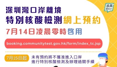 1、15日起,經深圳灣離境的旅客必須持有特別核酸檢測預約證明,方可進行有關檢測,預約系統14日已啟用。政府14日晚上表示,預約系統啟用至今運作暢順,目前尚有相當充裕的檢測時段可供預約。 2、為阻截病毒散播,衞生防護中心由15日起優化各口岸的離境程序,過關旅客的即場核酸檢測倘若呈陽性將即時獲發隔離令,由專車送入社區隔離設施檢疫。同日起,居家隔離人士均需要佩戴電子手環。