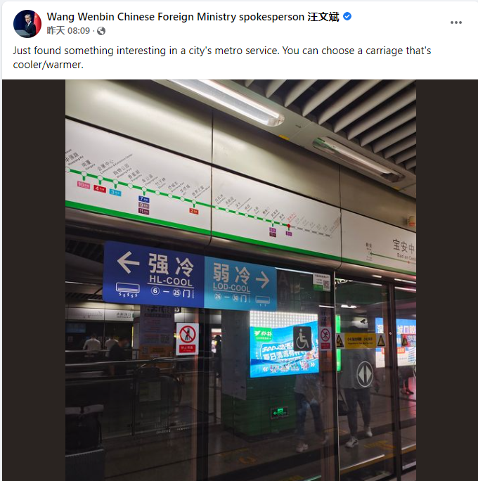 香港新聞網7月22日電 中國外交部發言人汪文斌發布的一張照片,引發香港網友熱議? 21日,汪文斌在社交媒體臉書分享一張照片,并配文“發現了一個城市的地鐵服務中一些有趣的地方,即你可以選擇進入強冷或弱冷的車廂。” 據照片顯示,一處地鐵站的透明護欄上貼有“強冷、弱冷”的指示。從照片露出的部分地鐵站名來看,拍攝地應是在中國深圳。 近期,熱浪侵襲北半球,氣溫高於往年,民眾對空調的需求大幅提升。而中國內地的部分地鐵不僅裝有空調,還提供不同溫度的車廂供市民選擇。此人性化的設計經汪文斌廣而告之後,隨即引發大批網友熱議,其中亦不乏香港網友。