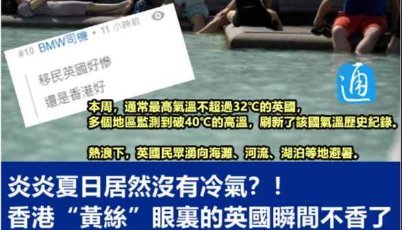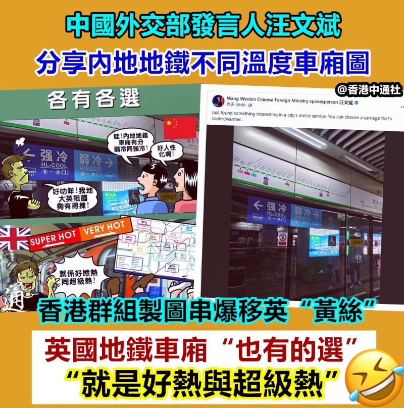 “內地發展一日千里,真正強國表現。”空調雖在香港頗為普及,但地鐵一直未有不同溫度的車廂,因此,香港網友見後紛紛忍不住點贊,直言想不到內地已如此“先進”,“人性化的設計,這樣的旅程太舒適了”,“想得好周到......我很怕太強的冷氣。” 部分香港“黃絲”選擇移英後,近期亦遭遇高溫“炙烤”,但因英國地鐵等設施鮮少裝有空凋,在香港網絡上,近期不時湧現出一批移英“黃絲”抱怨高溫,哀嘆“還是香港好”。 有香港社交群組索性將汪文斌分享的這張內地地鐵圖拿來,做了張與英國地鐵現狀的對比圖,笑言英國地鐵車廂“也有的選,就是好熱與超級熱”。 該社交群組還發文揶揄稱,“移英手足個個精英”,相信在英國出入有車代步,“應該沒這個問題”…… 此串爆移英“黃絲”在中國香港時“身在福中不知福”,如今只能於英國感受熱辣辣的夏天的對比圖一出,又引發大批香港網友追隨討論。 “叫英國來看下(內地地鐵照片)。”有香港網友猜測,他們看後心裡定不是滋味。 也有香港網友表示,現時移英“黃絲”“唯有降低水平,(才能)自我感覺良好”。 還有網友想起“黃絲”因空凋被關而搞事失敗的過往,“擔憂”這些忍不了熱的移英“黃絲”如何能安度英國的炎夏……