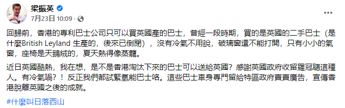 帖文末尾,梁振英還附上“什麼叫日落西山”的標籤。強調香港回歸後成就驕人,而“日落西山”的英國根本沒資格對香港事務指手畫腳。 梁振英的“倡議”一經發出,隨即引發大批香港網友點贊、附和。 有香港網友表示,“英國室內根本沒有空調設備”,可把那班習慣空調的香港BNO移民熱壞了。 “有一點可以肯定,香港地鐵一定比英國先進很多,而且可以上網。”一些網友對比起香港和英國這25年間的變化,感嘆“東升西降!” 不過亦有部分網友持“相反”意見。他們認為,“空調巴士燃油消耗大”,英國仍未擺脫“燃油荒”,應該節省點。“在英國,巴士有空調都沒用,油價高企,市民未必搭得起,所以感恩我們生於中國香港,感恩國家對香港同胞的支持及體諒。”