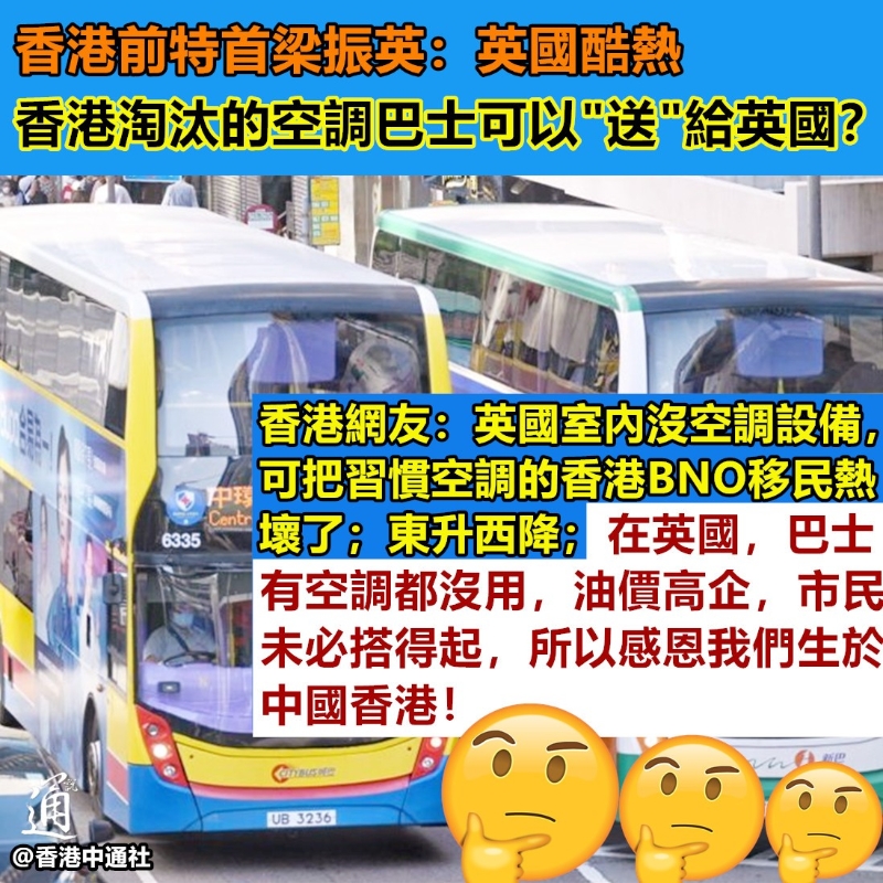 梁振英:香港淘汰的空調巴士可以“送”英國!香港新聞網7月26日電 時移世易,曾只能被迫使用英國二手巴士的香港,如今已被“建議”可把淘汰下來的空調巴士“送”給英國…… 近期,高溫熱浪襲歐,19日,英國出現破紀錄的40攝氏度高溫。但由於英國家庭及公共設施極少安設空調,這讓一眾移英港人的生活變得苦不堪言。在英國遭受高溫“炙烤”的這段時間裡,不少移英港人紛紛於網絡抱怨酷暑“難頂”...... 香港前特首梁振英見狀,近日有感而發地在社交媒體發帖“倡議”——把香港淘汰下來的空調巴士“送”英國! 梁振英表示,“回歸前,香港的專利巴士公司只可以買英國產的巴士,曾經一段時期,買的是英國的二手巴士。”直指這種巴士不僅沒有冷氣,破璃窗還不能打開,只有小小的氣窗,座椅是天鵝絨的,夏天熱得像蒸籠。 “近日英國酷熱,我在想,是不是香港淘汰下來的巴士可以送給英國?”說到這,梁振英自豪地稱,反正香港如今已嘗試讓氫能巴士“落地”了,認為“送”英國的一些香港巴士車身可“專門留給特區政府賣廣告,宣傳香港脫離英國之後的成就。”