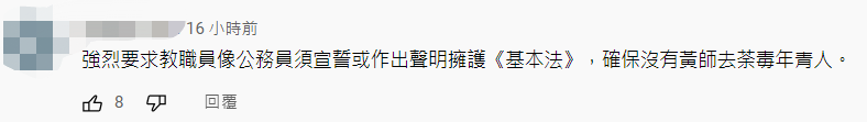 網友評論 亦有網友因此對香港教育環境感到“擔憂”,呼籲教職員應像公務員一樣宣誓或作出聲明擁護《基本法》,“確保沒有‘黃師’去荼毒年輕人。”