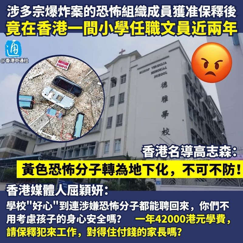 香港新聞網7月28日電 誰能想到,小學文員竟是有“黑歷史”的涉恐分子?如此匪夷所思之事,竟發生在今日香港…… 有傳媒披露,涉嫌多宗爆炸案的極端恐怖組織“九十二籖”成員楊怡斯,獲准保釋後竟在香港一間小學任職文員近兩年。 香港2020年初發生了3宗爆炸品案,警方經調查後起訴Telegram群組“九十二籤”管理員等6人,包括楊怡斯。她被控一項“串謀導致相當可能會危害生命或財產的爆炸”罪。令人沒想到的是,這名涉恐分子幾個月後,竟經“相熟人士”介紹,進入九龍塘德雅小學做了文員…… 對此,校方“解釋”稱,當時得悉楊怡斯正保釋候審,經評估各項風險後,不認為其會對學校安全造成風險,決定在案件沒有判決前給予她一次“更生”機會。且此人主要工作為處理文件,包括會議紀錄、學生資料等,不需進入課堂及接觸學生。 學校又稱,楊怡斯提供個人資料時,沒有提到所涉及案件,校方亦無搜尋到她的詳細資料。直至有傳媒查詢後,才知道其涉及案件的嚴重性,經校方、校董會、辦學團體同意後,已即時解僱楊怡斯。 然而,校方的有關說辭,顯然難令香港各界放下心來! 香港議員楊永杰就對傳媒直言自己的擔憂,指若楊怡斯心懷不軌,在校內煽動學生參與非法活動,或在校內製造自殺式爆炸,勢必嚴重危害全校師生安危,後果不堪設想。 香港名導高志森亦在社交媒體轉發有關消息,認為這是“黃色恐怖分子轉為地下化,不可不防。”