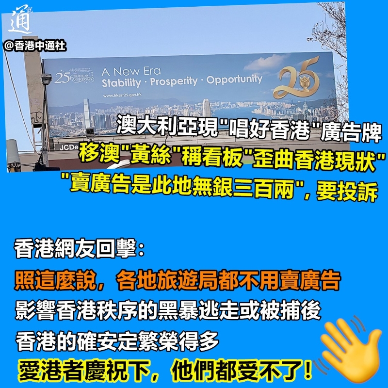 (圖源:推特) 據澳媒SBS中文報道,在澳港人組織“澳港聯”及“澳洲維港”分別向澳大利亞監管機構Ad Standard提出投訴。他們聲稱,港府對香港市民進行“政治打壓”,“嚴重違反人權”,認為有關廣告內容“不實”,嚴重違反澳大利亞國家廣告協會道德行為守則。 其中,“澳洲維港”的代表Joe(化名)攻擊宣傳板“是完全歪曲香港現狀的宣傳工具”;另一名在澳港人阿瑩(化名)則質疑廣告牌“粉飾太平”。 “要在其他國家賣廣告指自己很繁榮安定,即是表示其實情況根本就不是。”對著澳媒,阿瑩大發謬論,宣稱“賣廣告是此地無銀三百兩。” 棄保潛逃至澳大利亞的香港前立法會議員許智峯也來插一腳! 他在社交媒體發文抹黑稱,2019年以來的香港是個“徹底失去自由的獨裁社會”,絕非大型廣告牌中所宣傳的繁榮穩定。又妄言香港市民“活在水深火熱中”,港府“心虛,才會以謊言自我推銷。” “試問誰會相信這種香港故事呢?”帖文最後,許智峯聲稱,會對位於澳大利亞主要城市的14塊宣傳牌“投訴到底”,“海外可以做的,我們都會盡(量)做。感謝‘澳港聯’及各位澳洲‘手足’的努力。” 然而打臉的是,澳大利亞監管機構Ad Standard直言,僅收到少量投訴,且“這種類型的內容不在我們的管轄範圍內。” 展示廣告牌的戶外廣告巨頭JCDecaux亦指出,“在廣告發布之前,已根據戶外媒體行業的行業規範和指南,對廣告內容進行審查。”強調廣告牌“符合戶外廣告相關政策”。 足見,移澳“黃絲”的投訴,於情於理都站不住腳。 有關消息傳回香港後,更把大批網友逗樂了! “以此邏輯思考,如果歌星够真材實料、够紅,開演唱會都不用做宣傳啦。”有香港網友質問移澳“黃絲”:“照這麼說,所有好東西包括各地旅遊局,都不用賣廣告!” “人黃心就盲。”也有一些網友直指,近年部分外媒不斷造假新聞、弄出極偏頗的報道,所以港府才要登廣告澄清,務求讓外國人看到更多面的香港,“如果西媒不被嚴重操控,需要花這錢嗎?” 有明理的網友就力撐該廣告牌“沒毛病”——“肆意影響香港秩序的黑暴(分子)逃走或被捕後,香港的確安定、繁榮得多。” “愛港者慶祝下,他們都受不了!”還有網友揶揄移澳“黃絲”玻璃心。