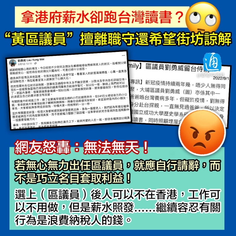 香港新聞網9月5日電 因不願宣誓或宣誓無效,早前部分反對派區議員提出辭職或被取消資格。在香港區議會面臨人手不足的情況下,又有在職的反對派區議員被投訴置區議會工作於不顧、擅自離港赴台讀書。對此,有網友怒斥其工資照拿,人卻不在香港,“無法無天!” 近日,香港大埔區議員劉勇威在社交媒體發文透露已抵達台灣,稱在台期間無法再到區議會開會,但就死撐說會繼續跟進辦事處的工作,以此顯示自己“有所作為”。