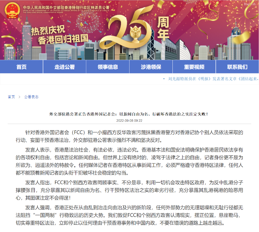 香港新聞網9月8日電 針對香港外國記者會(FCC)和一小撮西方反華政客污衊抹黑香港警方對香港記協個別人員依法采取的行動、妄圖干預香港法治,外交部駐港公署今日(8日)表示強烈不滿和堅決反對。