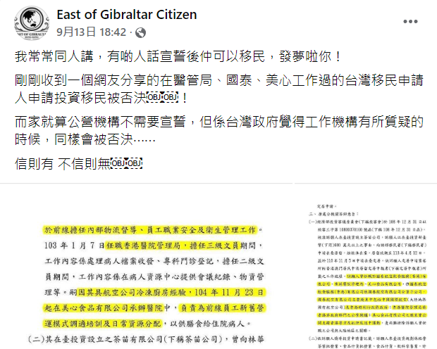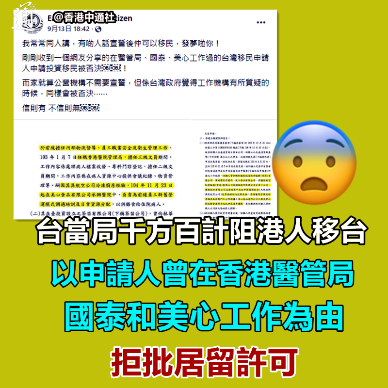 曾在國泰及美心工作,香港人被拒絕移台?香港新聞網9月15日電 在香港國泰航空及美心公司工作過,就不能移居台灣?台當局拒絕港人移台的理由越來越匪夷所思了…… 早前,不斷有港人哭訴闖台“失敗”,不過原因大多集中於他們曾在中企任職或“內地出生”成了原罪。近期,有社交媒體專頁分享一名港人移台被拒的案例時,義憤填膺地指出,台灣“移民署”以申請人曾在香港醫管局、國泰和美心工作為由,拒批居留許可。 “就算公營機構不需要宣誓,但是台灣當局(對)工作機構有質疑的時候,(申請)同樣會被否決⋯⋯”該社交媒體專頁提醒。