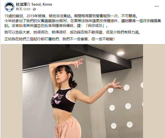香港新聞網9月20日電 聽聞香港女團中將有涉“黑暴”分子,且其還獲批離港赴韓國集訓一個月後,香港議員及網友紛紛表示不能忍! “黃絲”藝人杜汶澤在“修例風波”期間多次發表煽暴言論,遭到各界指責、在港難混下去的他於2020年11月赴台灣發展。 抵台後,杜汶澤賣過鴨血,搞過鳳梨冰。今年5月,他又宣布要組建一個香港女團,聲稱會與韓國娛樂公司合作,安排女團成員到韓國進行“地獄式集訓”。 據悉,該女團會在韓國拍攝首支跳舞單曲MV,於10月正式出道。值得注意的是,該女團除了發起人是“黃絲”藝人杜汶澤,另一個爭議點是有成員竟被控非法集結...... 昨日(19日),杜汶澤在社交媒體曬出女團的訓練照,並寫道,“19歲的樂兒,2019年被捕,被控非法集結。期間每周要到警署報到一次,不可離港。”