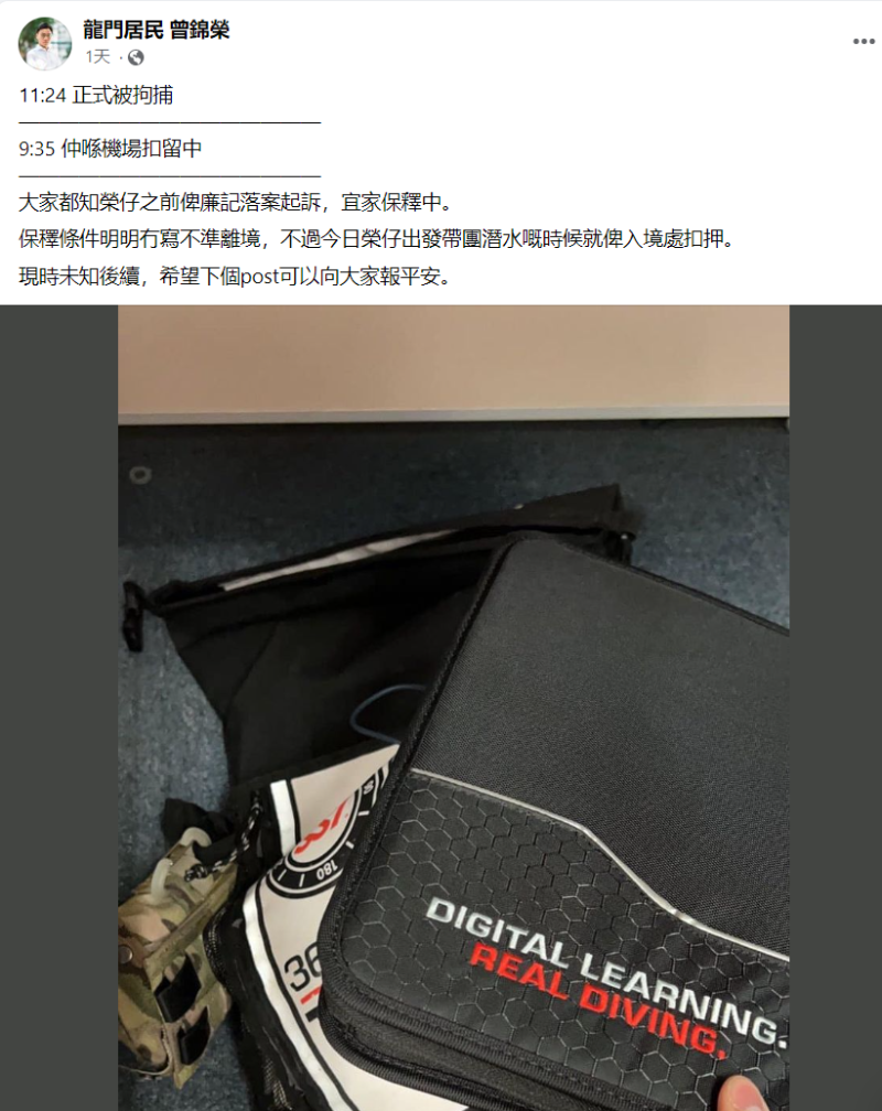 社交媒體截圖 曾錦榮還在社交媒體上發文“賣慘”,稱自己原來準備帶團去菲律賓潛水,現在因為被逮捕,“機票、酒店錢(連隔離酒店都訂好了)都虧了,學生也沒有了……” 今日(23日),曾錦榮又在社交平台與“同路人”更新事件後續,稱自己獲保釋至11月18日再審,期間不得離港。他繼續“哭訴”說因為不能離港,自己作為潛水教練的工作幾乎完全停頓,“希望生活盡早回復”。 不過,曾錦榮這番說辭,香港網友並不買賬! 有網友直接點出曾錦榮就是心虛潛逃——“公然潛逃還說(去)潛水!”“走佬(逃跑)的低級伎倆,想‘潛水’沒那麼容易!”