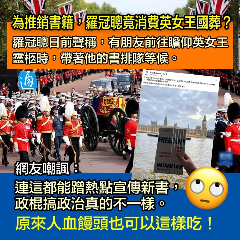 香港新聞網9月26日電 竄逃至英國、正被香港警方通緝的亂港分子羅冠聰,為推銷自己的書籍,竟消費起英女王國葬……無恥行為引來一眾網友嘲諷:“原來人血饅頭可以這樣吃。” 羅冠聰日前在社交平台發文聲稱,有朋友前往瞻仰英女王靈柩時,帶著他的書排隊等候。羅冠聰又王婆賣瓜、自賣自誇地稱,“感恩這本書可以陪伴香港人,希望各位都能夠將香港人的志氣帶到世界每一個角落。”
