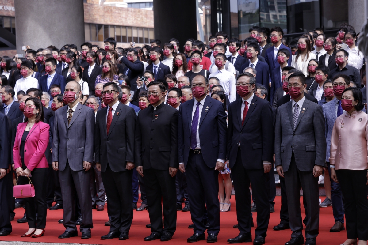 香港新聞網10月1日電(記者 曹文毓) 為慶祝中華人民共和國成立73周年,香港理工大學10月1日舉行升旗儀式,升旗手邁著鏗鏘有力的步伐護送國旗區旗進場,在國歌聲中,五星紅旗冉冉升起,全體師生面向國旗、區旗行注目禮並齊聲高唱國歌。 是日,香港特區政府保安局局長鄧炳強、文化体育及旅游局局长楊潤雄、民政及青年事務局局長麥美娟等人,以及香港理工大學校董會主席林大輝、校長滕錦光與大學管理層,帶領教職員、學生及校友等理大成員一同出席儀式,共賀國慶。儀式結束后,現場氣氛不減,不少嘉賓在現場合影留念。