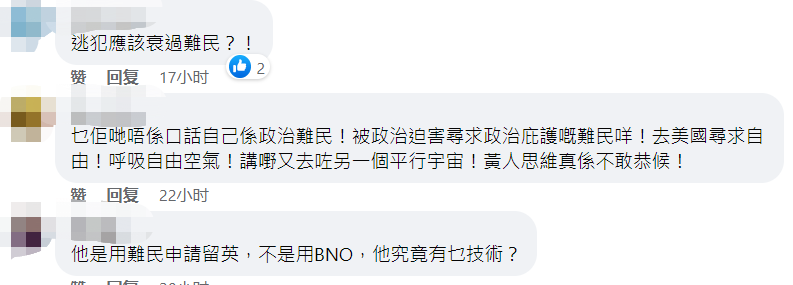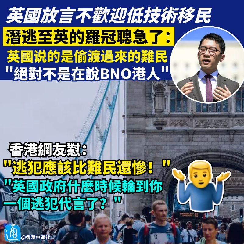 香港中通社製圖 不過,羅冠聰無力的辯白,遭到了網友的集體嘲諷! “逃犯應該比難民還慘!”“你說什麼就是什麼?(英國政府)什麼時候輪到你一個逃犯代言了?”香港網友紛紛嘲諷羅冠聰的有關說辭毫無說服力,不過是為英政府“找補”。 也有網友直指,羅冠聰曾賣慘說自己是尋求外國“政治庇護”的“政治難民”,現在又轉口說“難民”才是被英國人嫌棄的“低技術移民”……前後矛盾,自打嘴巴!
