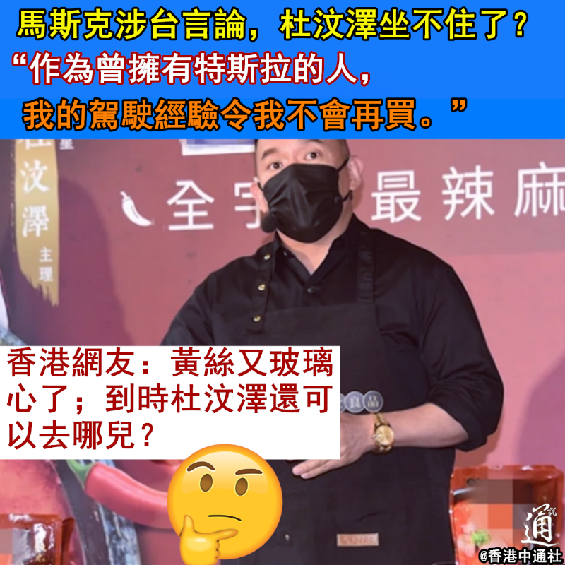 除了台灣政客,早前竄台的居港“黃絲”藝人杜汶澤也跳出來、頻刷存在感! 近日,他在社交媒體臉書發文、“陰陽怪氣”地寫道:“就馬斯克提議台灣成為‘特區’來避免台海衝突,我沒多大感覺,只覺得作為一個曾經擁有特斯拉的人,我的駕駛經驗令我以後不會再買。” 在回覆網友評論時,他又對馬斯克評頭論足道,“他做人怎樣我不清楚,他造車就不行。” 在其他帖文中,杜汶澤又自稱是“買不起特斯拉的台北慢活車神”。 不斷“蹭”馬斯克涉台言論熱度,言論中又暗示會“抵制”特斯拉……對此,有香港網友在網絡討論區嘲諷道,“黃絲又玻璃心了”。 “到時杜汶澤還可以去哪兒?”也有網友認為杜汶澤之所以如此不滿馬斯克言論,皆因有亂港背景的他擔心統一後又要“二次竄逃”……