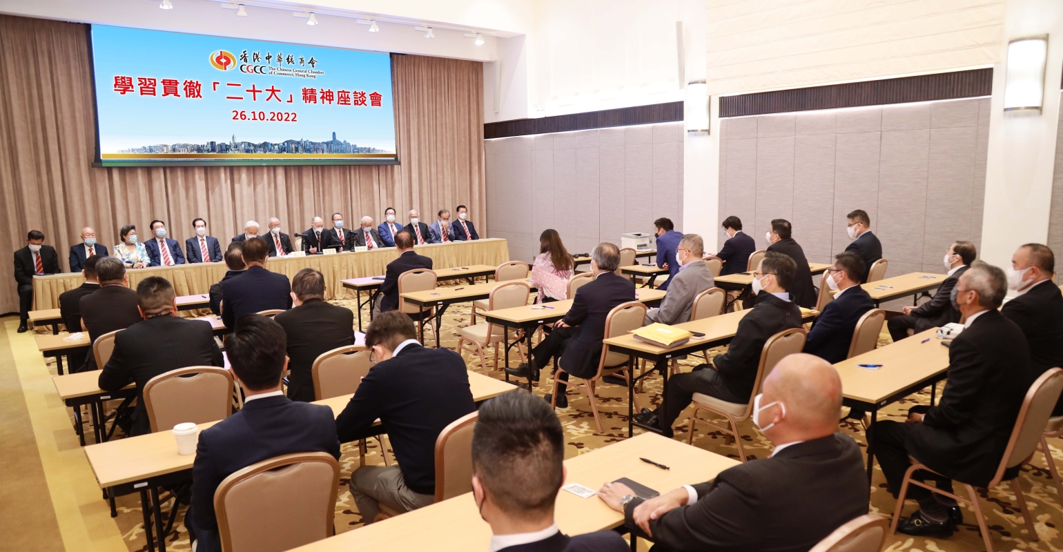 香港新聞網10月26日電 香港中華總商會26日舉辦學習貫徹中共二十大精神座談會。中總會長袁武,全國人大代表、中總永遠榮譽會長霍震寰,以及全國政協常委、中總永遠名譽會長蔡冠深,就二十大重要精神和內容要義分享感受和體會。