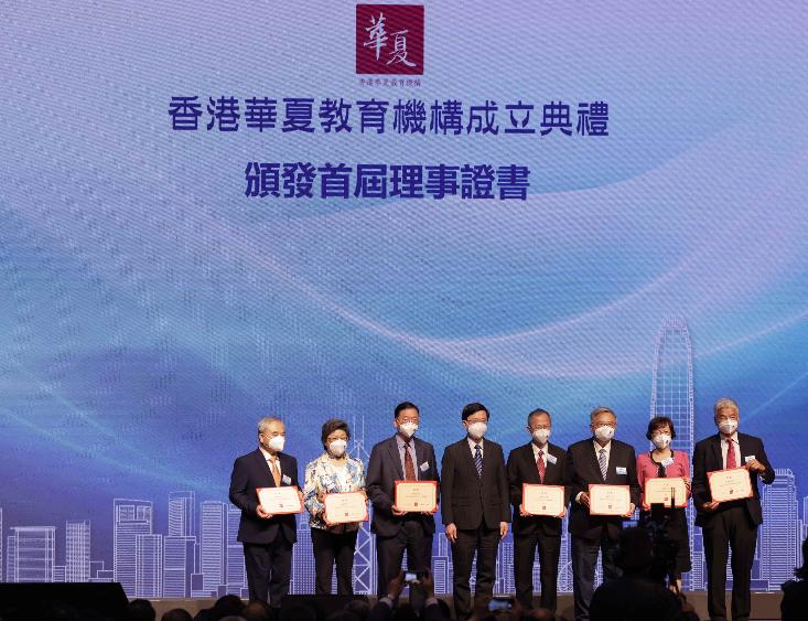10月29日,香港華夏教育機構成立典禮暨香港教育開新篇高峰論壇在會展中心舉辦,香港特區行政長官李家超、教育局局長蔡若蓮、香港華夏教育機構會長曾鈺成等人主禮開幕儀式。圖為李家超頒發香港華夏教育機構首屆理事證書。(香港中通社記者 曹文毓) 香港中通社圖片 當天,逾1100名香港及大灣區教育界人士出席活動。行政長官李家超、教育部副部長田學軍、中聯辦副主任盧新寧、華夏教育機構會長曾鈺成分別致詞。 機構轄下有15所學校,從上世紀起,這些學校堅守育人陣地,播撒愛國火種。曾鈺成表示,推行愛國教育是這批學校的基本宗旨和共同特色,然而,過去港英當局並不支持及鼓勵愛國教育,令這些愛國學校受到排擠和壓制,香港回歸祖國以後,憲制地位亦轉變,愛國應該成為社會主流價值。 曾鈺成指出,在“一國兩制”下,推行愛國教育非常重要。愛國辦學團體在香港教育工作中累積豐富的經驗,今年初聯合組成“香港華夏教育機構”,發揮自身的優勢,除了在團體之間建立資源共享、互相促進、推動業務發展和教育研究的平台,同時也為了與其他辦學團體和教育機構交流合作。香港教育正處於“由治及興”重要時刻,機構決心與教育界全體同工一起響應時代的呼喚,同為教育開新篇。 他笑言自己雖然是一名數學老師,卻相信“1+1大於2”,期望機構推動盼學界共推愛國教育,引領青少年認識國家及世界大勢,增強民族自豪感及主人翁意識,為“愛國者治港”的方針培養人才。 廣東省教育廳、深圳市教育局以及香港多個教育團體發了賀電。 在成立典禮結束後舉行的香港教育開新篇高峰論壇上,香港特區政府教育局局長蔡若蓮、國家教育改革領導小組辦公室原副主任袁振國等分別作了演講。(完) 【編輯:胡雪石】