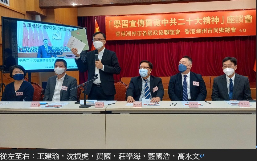 香港新聞網10月29日電 29日下午,香港潮州市各級政協聯誼會及香港潮州市同鄉總會聯合舉辦“學習宣傳貫徹二十大精神座談會”,邀請全國政協委員、香港立法會議員、香港工聯會理事長黃國,以及潮州市委常委、統戰部部長曾曉佳女士為主講嘉賓。座談會以線上線下相結合的形式進行。