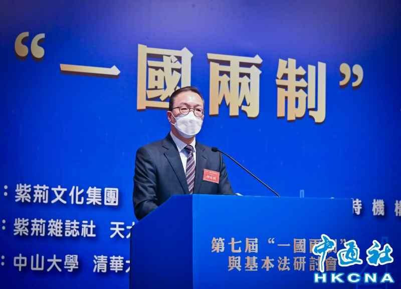 香港特區律政司司長林定國資深大律師31日在紫荊雜志社第七屆“一國兩制”與基本法研討會上致辭。香港中通社圖片 香港特區政府律政司司長林定國致辭表示,要推廣法制教育,培養每一位市民成為國家憲法秩序的尊重者、遵守者。中共二十大修改黨章,關於港澳“一國兩制”部分,新加入“全面準確、堅定不移貫徹一個國家、兩種制度”。他相信,“堅定不移”是最清楚、最強烈的方式,表達對香港實行“一國兩制”方針不變的決心,必須“全面準確貫徹落實”,香港居民應自覺尊重維護國家根本制度。 政務司副司長卓永興致辭表示,憲法與基本法共同構成香港特區的憲制基礎。新一份施政報告中公佈,由政務司司長領導的基本法推廣督導委員會將改名為憲法和基本法推廣督導委員會,反映特區政府對推廣憲法工作的重視,並會進一步推展憲法、基本法和香港國安法的宣傳教育。 全國人大常委譚耀宗以“二十大精神為基本法落實指引方向”為題發表視頻演講。他說,貫徹落實好基本法,是香港最大的制度優勢和自信,“一國兩制”是中國共產黨的偉大創舉,也是社會主義現代化中重要的組成部分,只有正確認識憲法和基本法,才能推動“一國兩制”行穩致遠。 二十大報告指要推進祖國統一及解決台灣問題。譚耀宗說,“一國兩制”的初衷就是為了和平解決台灣問題,所以香港的“一國兩制”越是成功,基本法落實得越好,越有利於祖國和平統一,有利於人心回歸。 全國人大常委會香港基本法委員會副主任譚惠珠以“新時代新征程”為題作演講時指,香港要回應新時代的呼喚,充份發揮“一國兩制”的優勢,走上建設社會主義現代化國家的新征程。在國家發展的新征程中,香港要成為推動國家經濟發展的引擎,做到國家所需的“聯通世界的開放”,這是內地城市暫未能做到的。 【編輯:馬華】