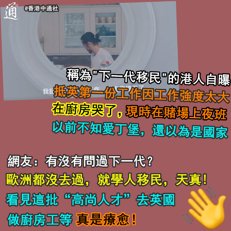 (製圖 劉春) “個個都說為小朋友,其實沒有一個尊重小朋友的意願。”也有網友義憤填膺地指,“我相信問10個小朋友,10個都會說想留在香港,(因為)他們出生以來的朋友全部都在香港......” 還有一些網友擔憂,如果這些移英人士失敗了,即6年後無法成功入籍英國,“就變成害了下一代”。他們認為影片不應該只播放Ice的“片面之詞”,也應該問下小朋友以及Ice留在香港的母親和岳父母,了解他們對移英一事的看法。 誠如網友所言,移英港人所謂“為下一代移民”的說法,其實根本站不住腳! 香港紀惠集團副主席及行政總裁湯文亮早前就在社交媒體發文爆料,稱有回流港人透露,自他們一家移民去了英國後,原本讀書很厲害的兒子突然放棄學業,理由是父母在香港持有專業資格,又有不錯的職業,移民去了英國都要做最基層的工作。 所以,該移英港人的兒子認為讀書是“多餘”的、念得再多以後在英國也要做最基層的工作……經過深思熟慮後,該移英港人決定舉家回流香港! 可見,“為下一代離港赴英”往往是移英港人一廂情願的想法,離開故土香港,這些下一代未必成長得更好,或許目睹父母從白領淪為基層工的他們更喪失了奮鬥的動力。 Ice一家三口現時雖居於愛丁堡,可人離鄉賤,為了在異國他鄉生存下去,Ice只得去“品流複雜”的賭場上夜班,與子女不同的作息時間亦令兒子少了父親陪伴的機會,難道這樣的環境會對香港下一代的成長有利? 【編輯:刘春】
