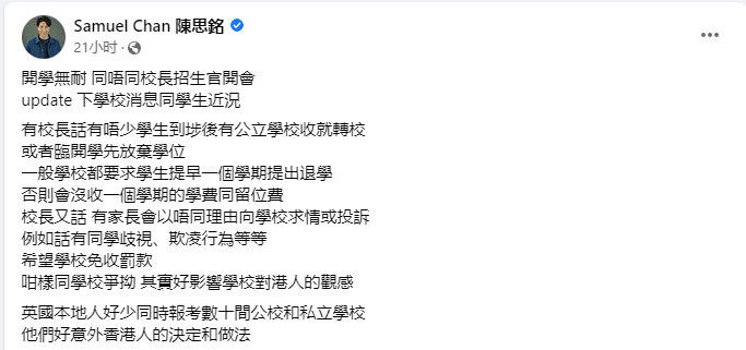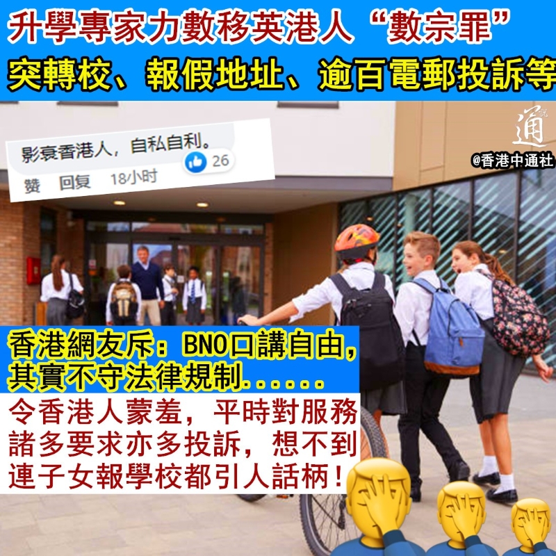 據悉,就退學的處理,英國學校一般會要求學生提早一個學期提出,否則需沒收一個學期的學費及留位費,總費用約6萬元(港幣,下同)。然而,部分移英港人為了省下這筆費用,會以學校出現歧視欺淩行為、教學“貨不對辦”等理由與學校“談判”,期望校方能豁免有關罰款。 亦有一些移英港人在預算不足的情況下,仍強行安排子女就讀昂貴的私立學校, “自信”地認為子女可在中途轉至公立學校就讀。結果發現“美夢”破碎後,“兩頭不到岸”的他們又跑去向私立學校“求情”,盼望私校可減學費或提供資助等。 有英國學校招生官就透露,部分移英港人家長曾透過電郵或電話對學校“狂轟濫炸”,催促學校回覆,或向校方職員施壓,“威脅”若再收不到回覆就向校長投訴等。 更令人瞠目結舌的是,有英國私校發現數個BNO港人家庭為了報讀區內學校,竟填報同一地址,偽裝居於該區…… 一系列操作令升學專家忍不住直批,這會令英國學校對香港BNO家庭產生負面印象,影響之後有意赴英升學的港生。並透露已有私校考慮提高港生的錄取門檻,以及向持BNO簽證的學生收取報名行政費或加重他們的退學罰款等。 升學專家喊話港人,既然已經移英就應該理解並融入當地文化,不要事事都以港式標準來批判英國人,“玩爛香港人招牌”。 升學專家力數移英港人“數宗罪”的消息於網絡流傳後,有香港網友直言不意外,認為這是BNO移民“本性畢露”的表現——“口講自由,其實不守法律規制,自以為是”。 有網友指出,移英港人頻繁轉校、肆意破壞規矩的行為會令真正有需要的人無法入讀家附近的學校,批評他們濫用資源,應該被罰款。 但也有網友認為,罰錢對移英港人起不了震懾作用,只有取消他們的BNO簽證、遣返回港才行! 在香港網絡上,不少網友紛紛痛斥部分移英港人“臭名遠播”,破壞港人在海外的形象。 “令香港人蒙羞,平時對服務、購物諸多要求亦多多投訴,想不到連子女報讀學校都引人話柄!學費講價都有......”有網友怒批這些移英港人“自私自利,不顧他人感受”,強調香港家長的身教也存在問題,“講一套做一套”。