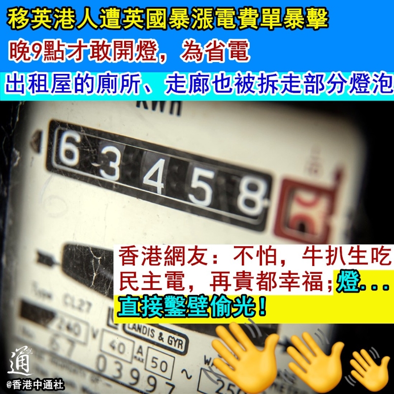移英港人頂不住“民主電價”,“手足”獻計鑿壁偷光?香港新聞網11月8日電 移英港人剖白“頂不住”英國暴漲的電費賬單、晚9點才敢開燈後,有“手足”出餿主意——鑿壁偷光如何? 近年,一些移英港人抵英後發現所謂“自由民主”的生活與想象中相距甚遠,紛紛忍不住於故土香港的網絡上感嘆移英生活不易,妄圖尋找慰藉……在“香港人移民英國討論區”社交媒體群組裡,有移英港人就曾抱怨付過一個月300英磅(約2700港元)的電費單,連老火湯都不敢煲。 近日,香港一名環保組織工作者亦在媒體上發文,講述移英港人如何在高昂的電費賬單下掙扎求存…… 據介紹,港人阿庭在移居英國前,就已向移英的朋友打聽過關於電費的事,結果被告知英國電費“沒有最貴、只有更貴”。移英後,阿庭一家三口更遭受到高昂電費單的迎頭暴擊。
